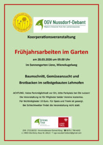 Der Workshop findet als Kooperationveranstaltung des OGV Nussdorf Debant und dem Sonnengarten Lienz statt und ist für Mitglieder kostenlos. Für Nichtmitglieder beträgt der Kostenbeitrag € 10,-. Für Speis und Trank ist gesorgt.