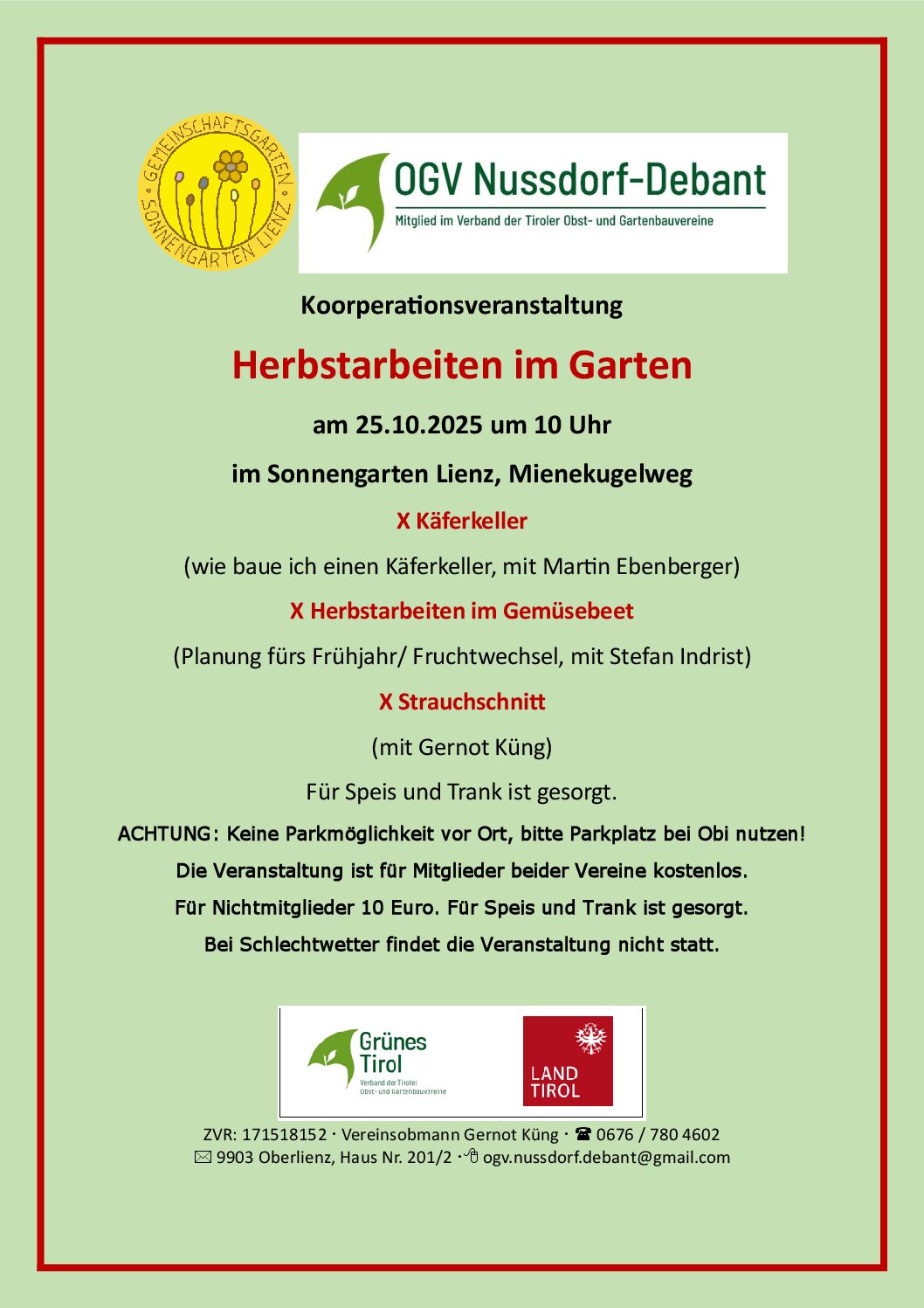 Workshop am 25. Oktober 2025: Wie baue ich einen KÄFERKELLER. (mit Martin Ebenberger), HERBSTARBEITEN IM GEMÜSEBEET (mit Stefan Indrist), STRAUCHSCHNITT (mit Gernot Küng). Dies ist eine Koorperationsveranstaltung vom OGV Nussdorf-Debant und dem Gemeinschaftsgarten Sonnengarten Lienz.